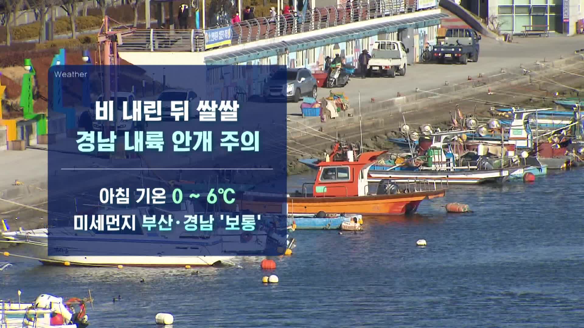 경남 남부 최저기온은 하동 2도 사천 1도 고성이 1도, 남해 4도 통영 5도 거제 4도로 오늘보다 1도 가량 낮겠습니다.